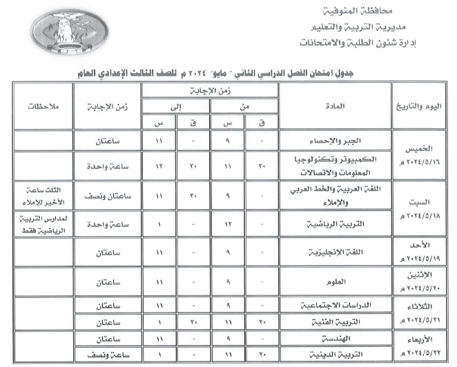 جدول امتحانات الفصل الدراسى الثانى للصف الثالث الإعدادى بالمنوفية 2024