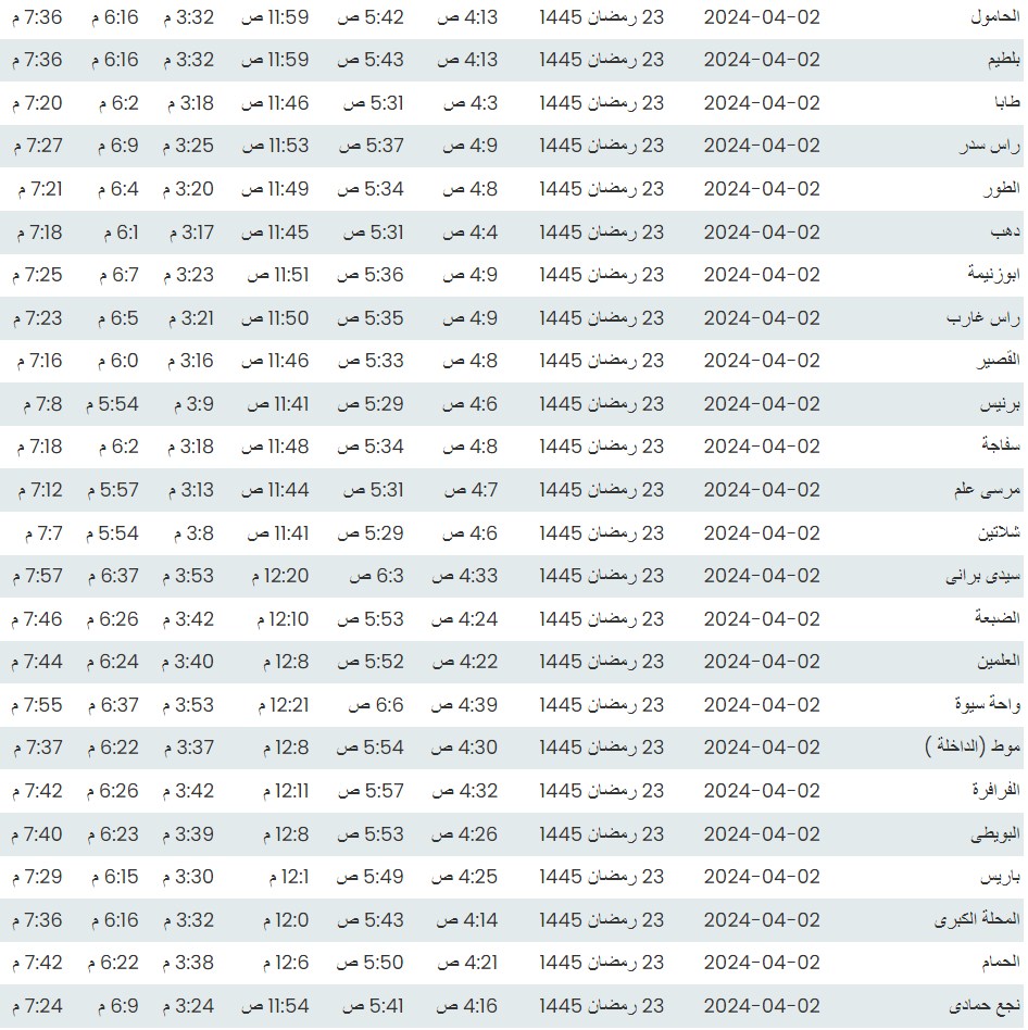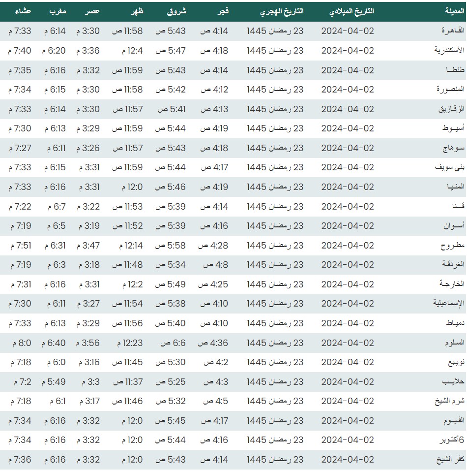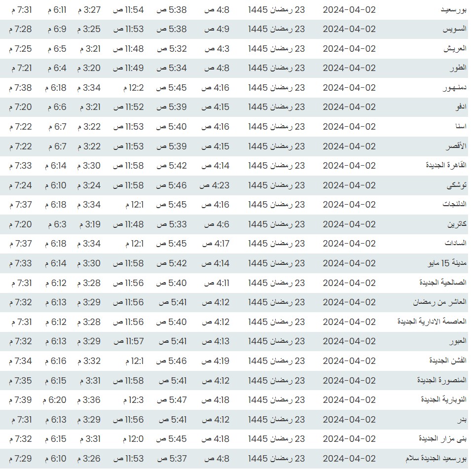 وفيما يلي مواقيت الصلاة، لعدد من مدن ومحافظات الجمهورية من واقع بيانات الهيئة العامة للمساحة