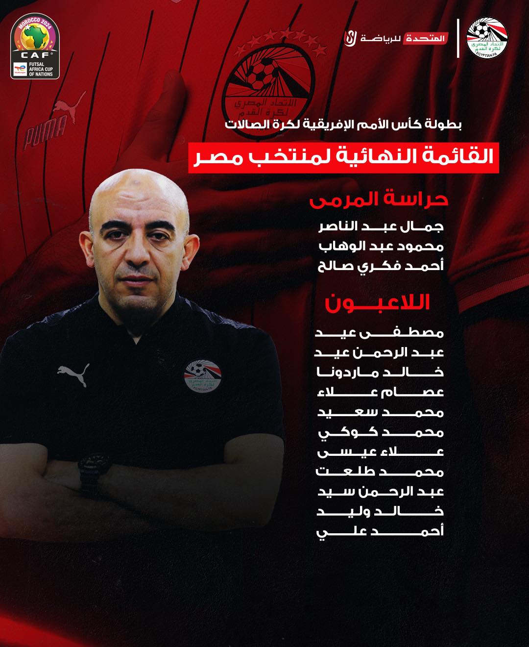 وجاءت قائمة منتخب الصالات استعدادًا لبطولة كأس أمم أفريقيا التي ستقام في المغرب خلال شهر أبريل الحالي كالتالي: