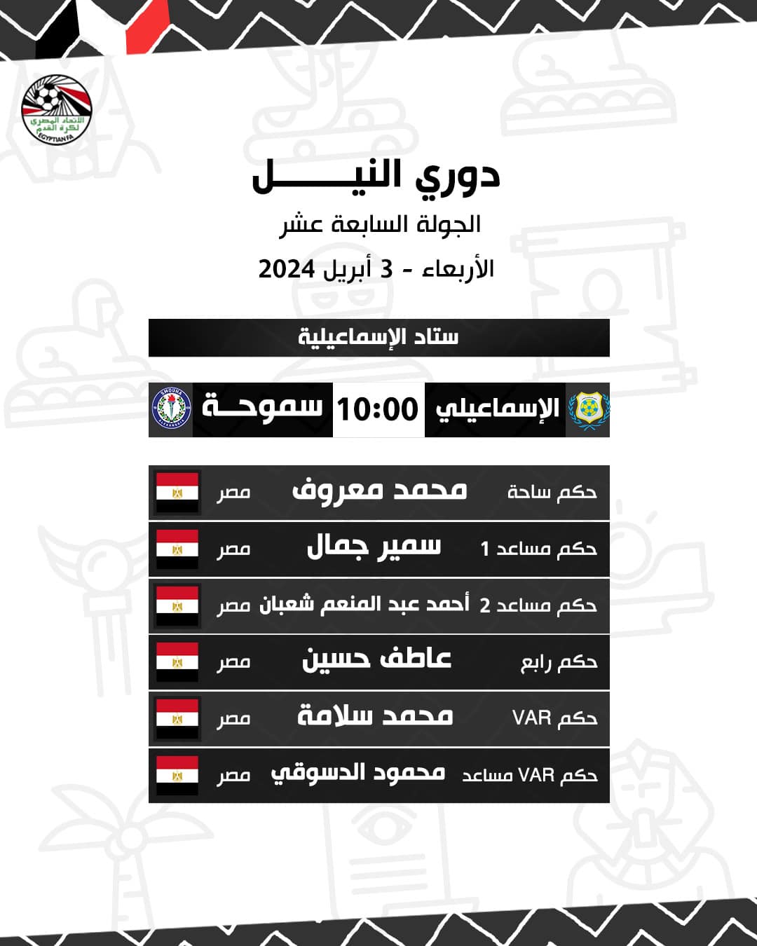 وأسندت لجنة الحكام إدارة مباراة الإسماعيلي وسموحة، التي تقام مساء غد الأربعاء، على ملعب استاد الإسماعيلية، إلى الحكم محمد معروف حيث جاء طاقم التحكيم كالتالي:
