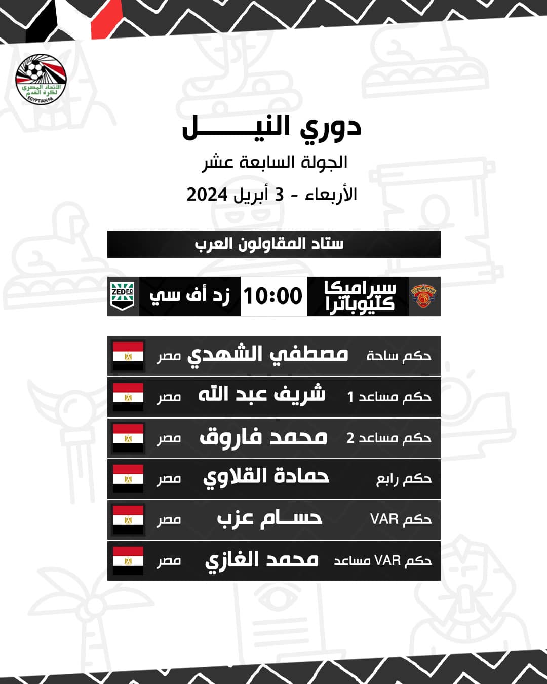 فيما أسندت لجنة الحكام إدارة مباراة سيراميكا كليوباترا وزد، التي تقام مساء غد الأربعاء، على ملعب استاد المقاولون العرب، إلى الحكم مصطفى الشهدي حيث جاء طاقم التحكيم كالتالي: