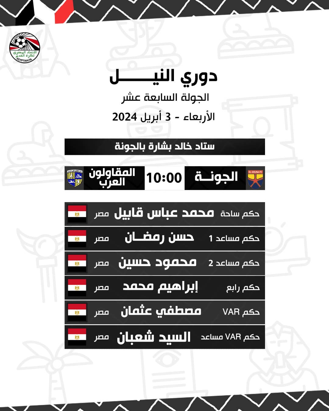 فيما أسندت لجنة الحكام إدارة مباراة الجونة والمقاولون العرب، التي تقام مساء غد الأربعاء، على ملعب استاد خالد بشارة، إلى الحكم محمد عباس قابيل حيث جاء طاقم التحكيم كالتالي: