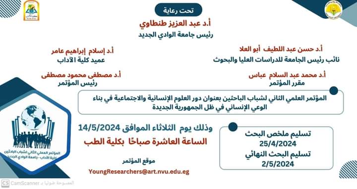 تستعد كلية الآداب جامعة الوادي الجديد، لعقد المؤتمر العلمى الثاني لشباب الباحثين بعنوان "دور العلوم الاجتماعية والانسانية في بناء الوعى الانساني في ظل الجمهورية الجديدة"، وذلك منتصف مايو المقبل بمقر كلية الطب بالجامعة، تحت رعاية الدكتور عبدالعزيز طنطاوي رئيس جامعة الوادي الجديد والدكتور حسن عبداللطيف نائب رئيس الجامعة للدراسات العليا والبحوث والدكتور إسلام إبراهيم عامر عميد الكلية والدكتور محمد عبدالسلام عباس مقرر المؤتمر والدكتور مصطفى محمود مصطفى رئيس المؤتمر.