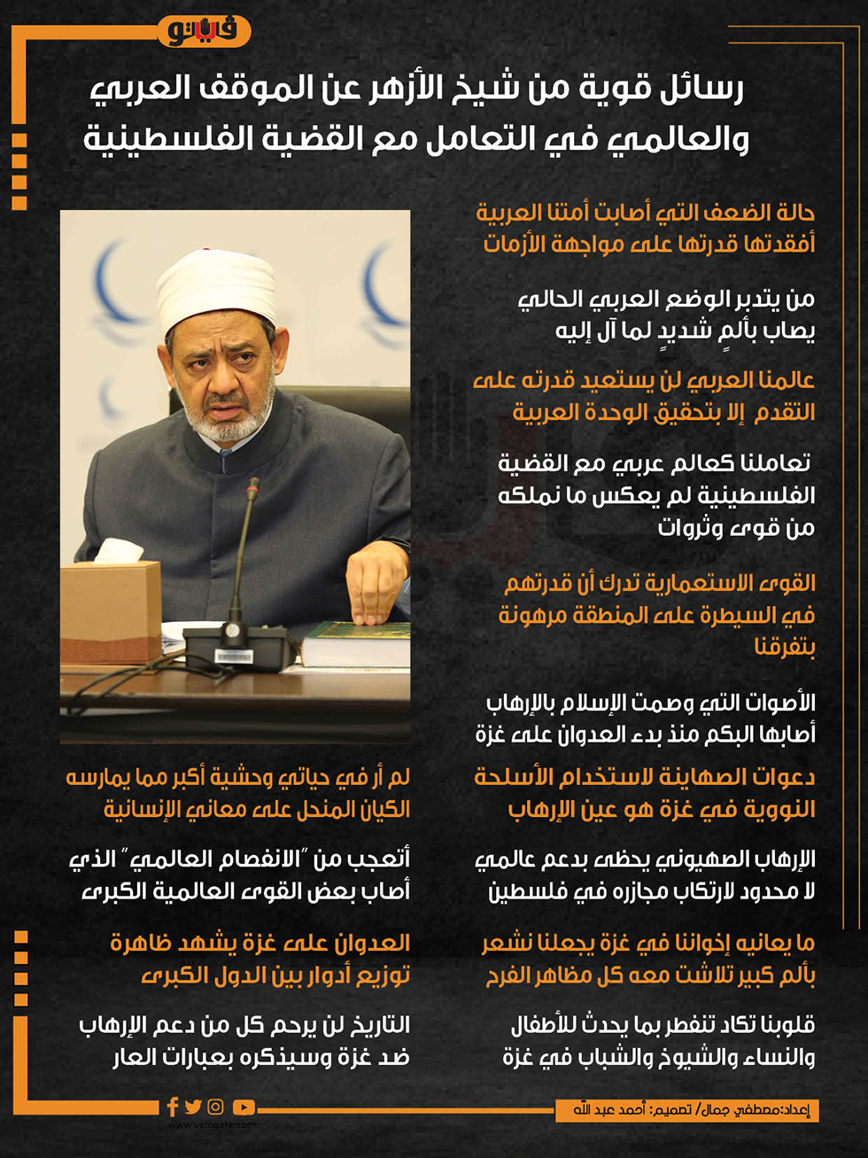 رسائل قوية من شيخ الأزهر عن الموقف العربي والعالمي في التعامل مع القضية الفلسطينية (إنفوجراف) الأربعاء 03/أبريل/2024 - 09:32 م 4/3/2024 9:32:08 PM الدكتور أحمد الطيب شيخ الأزهر، فيتو مصطفى جمال شارك طباعة 18 حجم الخط شارك طباعة القضية الفلسطينية العدوان على غزة غزة سطين شيخ الأزهر