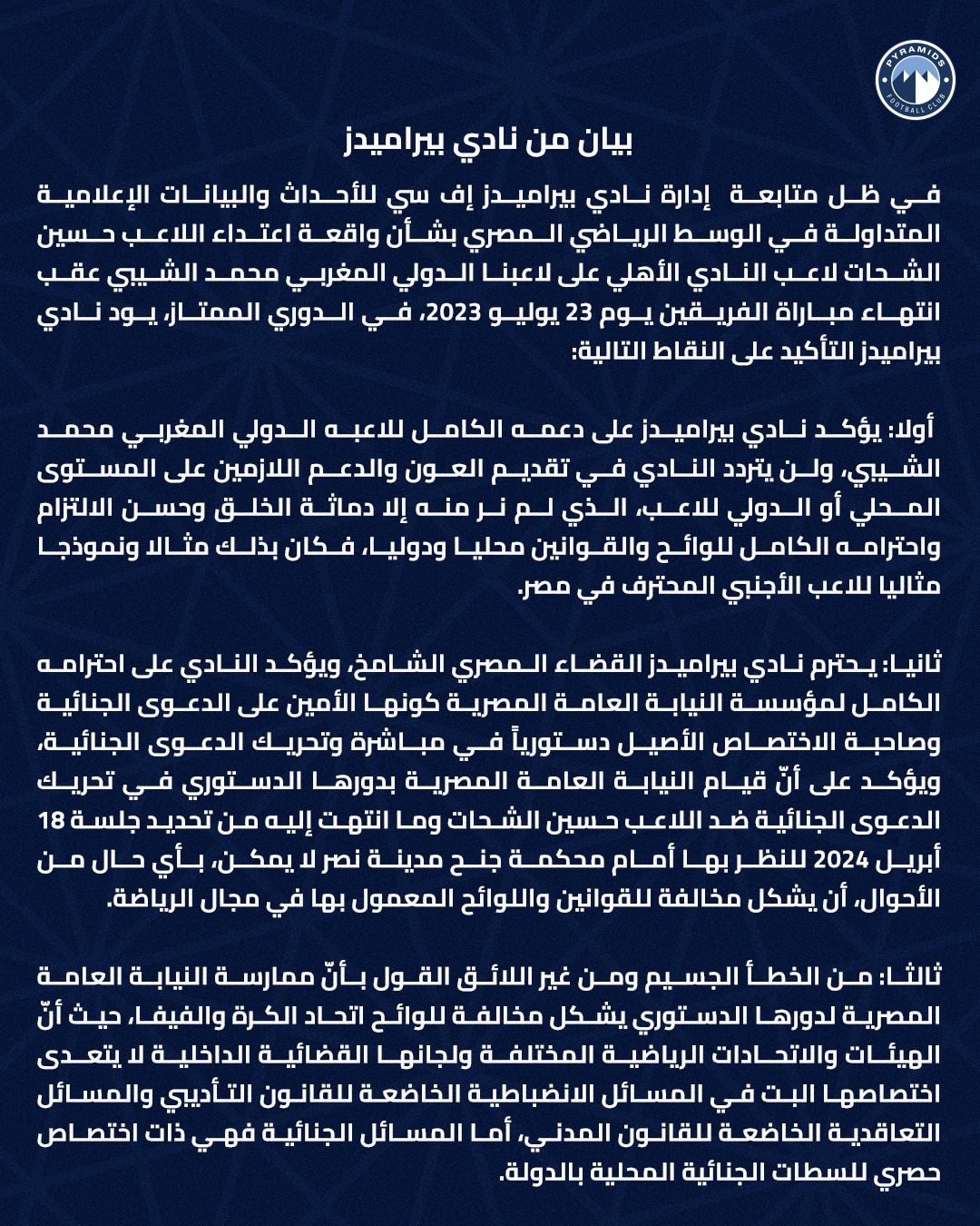 أولًا: يؤكد نادي بيراميدز على دعمه الكامل للاعبه الدولي المغربي محمد الشيبي، ولن يتردد النادي في تقديم العون والدعم اللازمين على المستوى المحلي أو الدولي للاعب، الذي لم نر منه إلا دماثة الخلق وحسن الالتزام واحترامه الكامل للوائح والقوانين محليا ودوليا، فكان بذلك مثالا ونموذجا مثاليا للاعب الأجنبي المحترف في مصر.