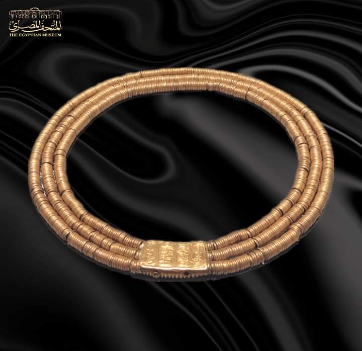 عرض المتحف المصري بالتحرير قلادة ذهبية تحمل اسم بسوسنس الأول بقاعة كنوز تانيس، وذلك بمناسبة ذكرى وضع حجر أساس المتحف المصري بالقاهرة.