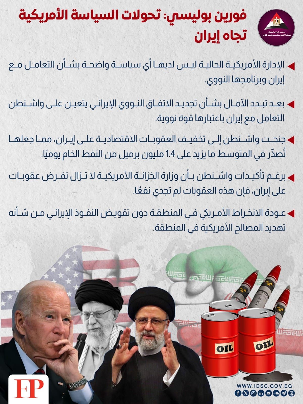 كشفت الصفحة الرسمية لمركز المعلومات ودعم اتخاذ القرار بمجلس الوزراء على موقع التواصل الاجتماعي "فيسبوك" عن تحولات السياسة الامريكية تجاه إيران.
