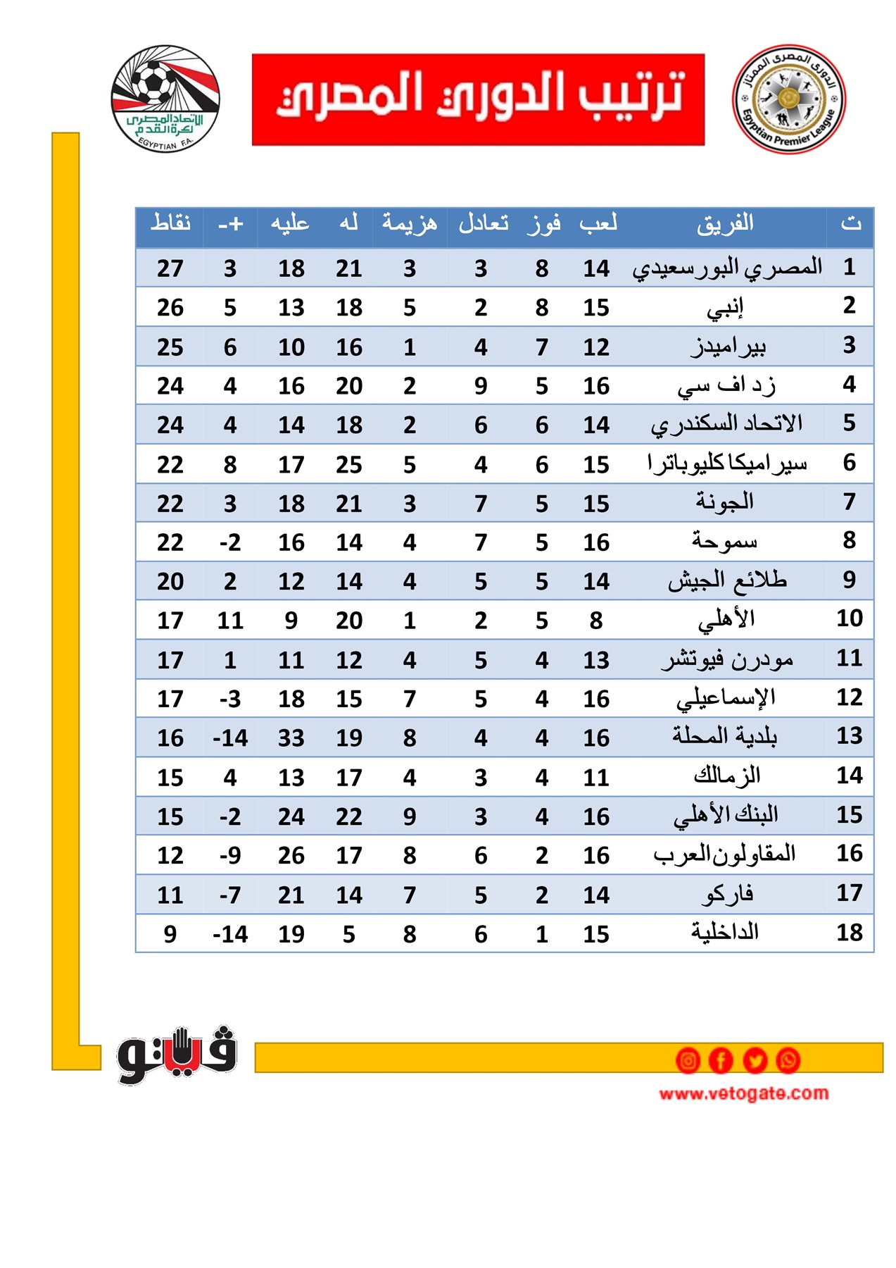 3- بيراميدز 25 نقطة، من 12 مباراة