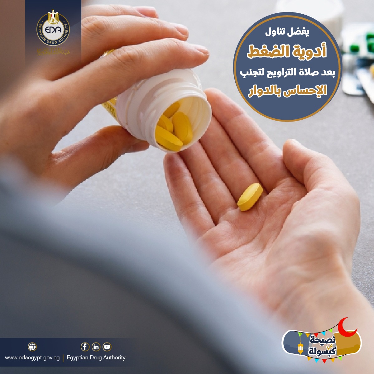 أكدت هيئة الدواء المصرية أن الوقت الأمثل لتناول أدوية الضغط في شهر رمضان بعد صلاة التراويح، لتجنب الإحساس بالدوار.