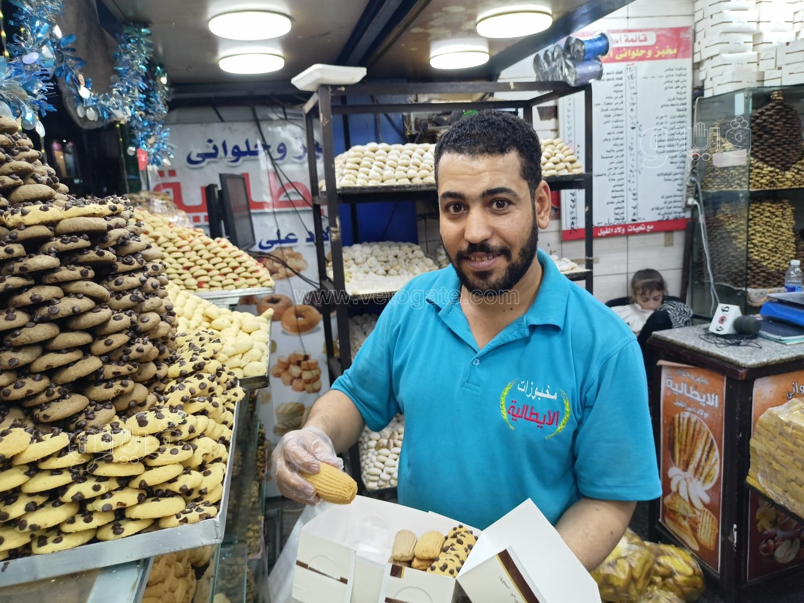 وفي المحال والمخابز يواصل الشباب العاملين بها، صناعة مخبوزات عيد الفطر المبارك، منذ بدء العشر الأواخر من شهر رمضان الكريم، فهم يتحدون لهيب النار الساخن من أجل كحك العيد والبسكويت، والتي زينت واجهات المحلات بأشكالها المختلفة.