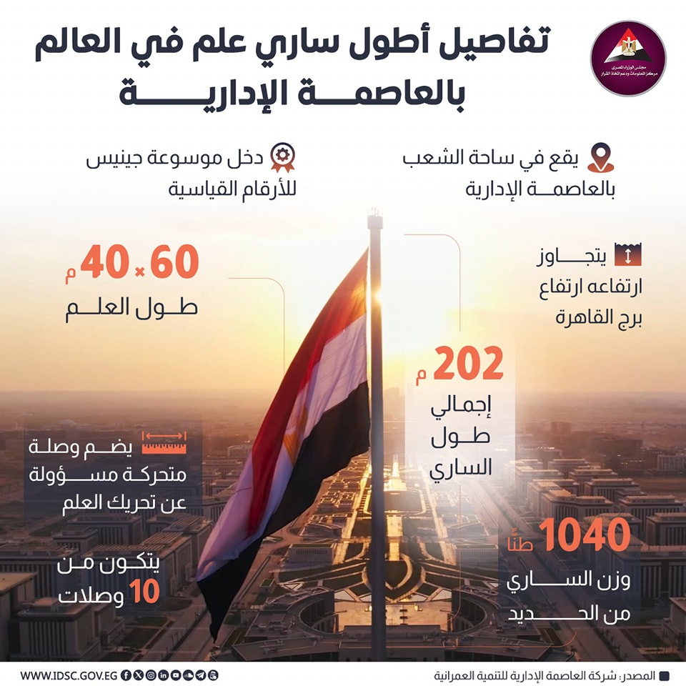 كشفت الصفحة الرسمية لمركز المعلومات ودعم اتخاذ القرار بمجلس الوزراء على موقع التواصل الاجتماعي "فيسبوك" عن تفاصيل أطول ساري علم في العالم بالعاصمة الإدارية.