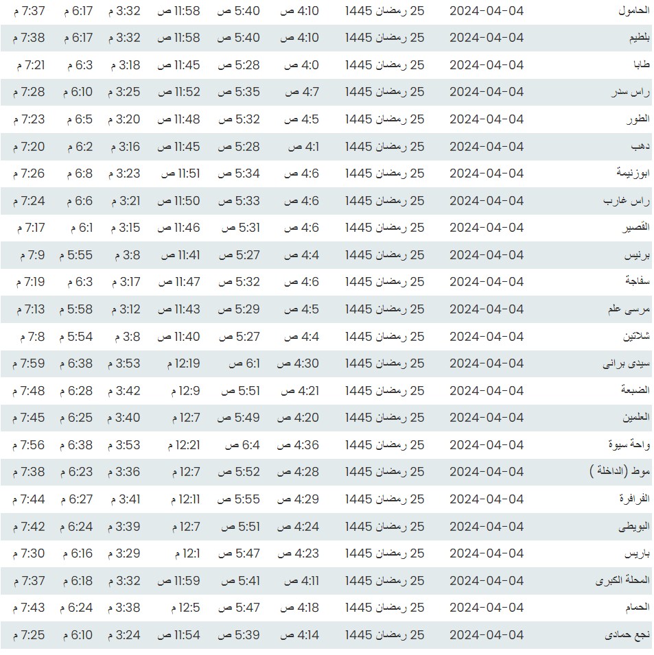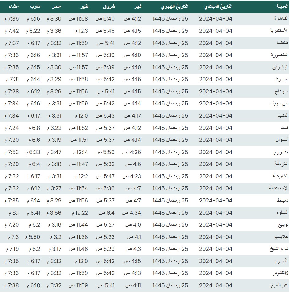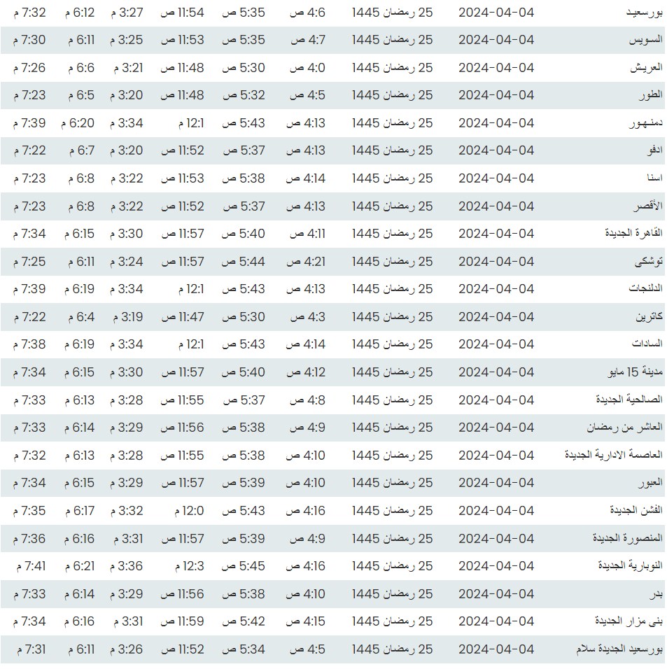 وفيما يلي مواقيت الصلاة، لعدد من مدن ومحافظات الجمهورية من واقع بيانات الهيئة العامة للمساحة