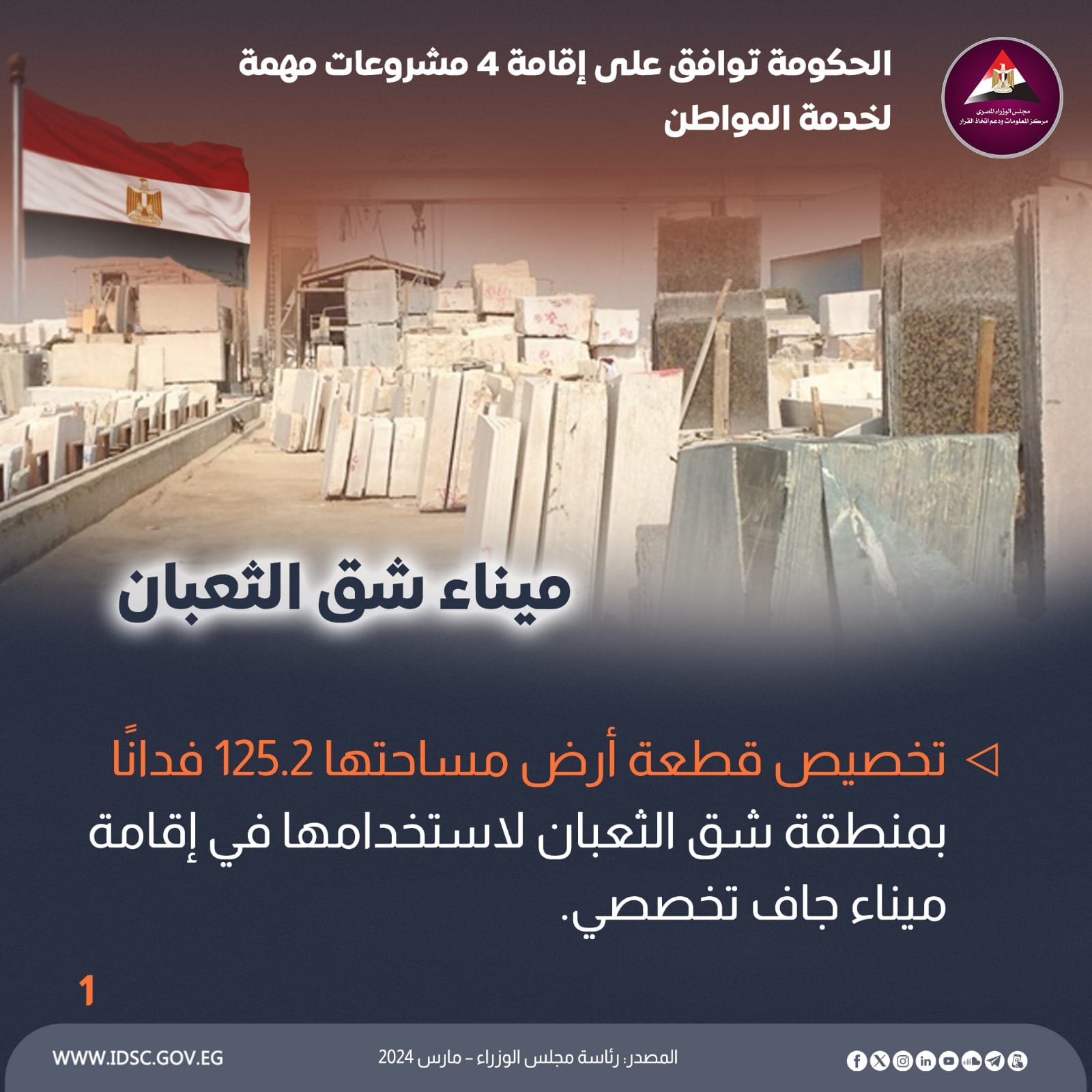 حيث وافق الدكتور مصطفى مدبولي، رئيس مجلس الوزراء، على عدة مشاريع، منها مشروع قرار رئيس الجمهورية بتخصيص قطعة أرض مساحتها 125.2 فدان بمنطقة شق الثعبان لاستخدامها في إقامة ميناء جاف تخصصي.
