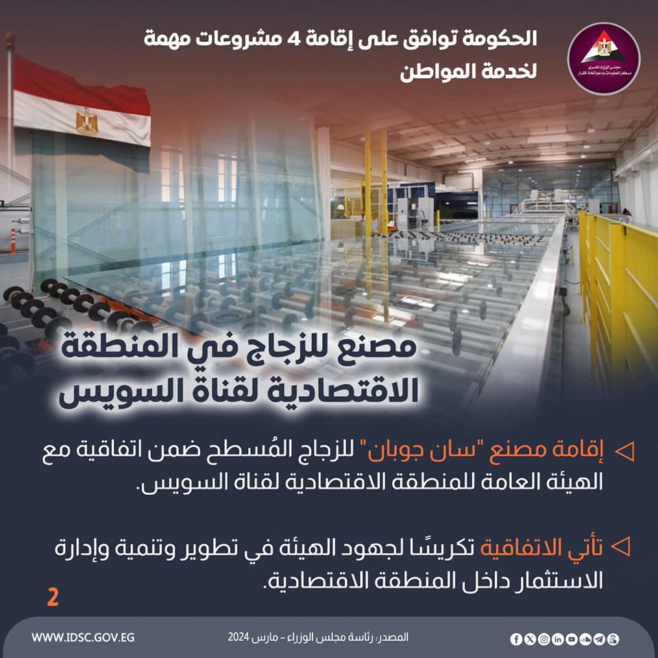 كما وافق الدكتور مصطفي مدبولي على مشروع اتفاقية إطارية لإقامة مصنع "سان جوبان" للزُجاج المُسطح بـالمنطقة الاقتصادية لقناة السويس،تستهدف هذه الاتفاقية وضع إطار للتعاون المستقبلي بين الطرفين، بقيام تحالف شركات سان جوبان مصر للزجاج، المُتخصصة في صناعة الزجاج، بإقامة مصنع جديد للزجاج المُسطح، داخل المنطقة الاقتصادية لقناة السويس، على مساحة قدرها 200 ألف م2، بالمنطقة الصناعية بالعين السخنة، بحجم استثمارات أجنبية مباشرة يتجاوز 160 مليون يورو، خلال السنوات الخمس الأولى للمشروع.