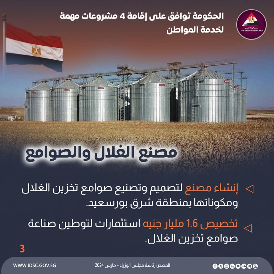 كشفت الصفحة الرسمية لمركز المعلومات ودعم اتخاذ القرار بمجلس الوزراء على موقع التواصل الاجتماعي "فيسبوك" عن موافقة الحكومة على إقامة 4 مشروعات مهمة لخدمة المواطن.