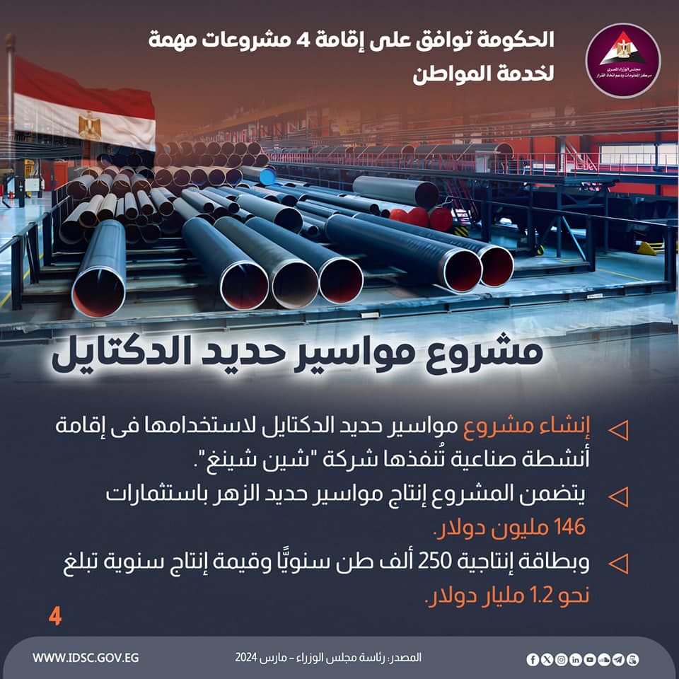 يتضمن المشروع مواسير حديد الدكتايل إنتاج مواسير حديد الزهر، باستثمارات 146 مليون دولار، بطاقة إنتاجية 250 ألف طن سنويًا، وقيمة إنتاج سنوية تبلغ نحو 1.2 مليار دولار.
