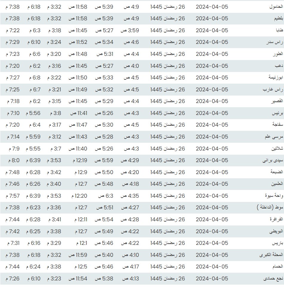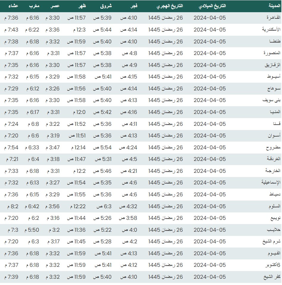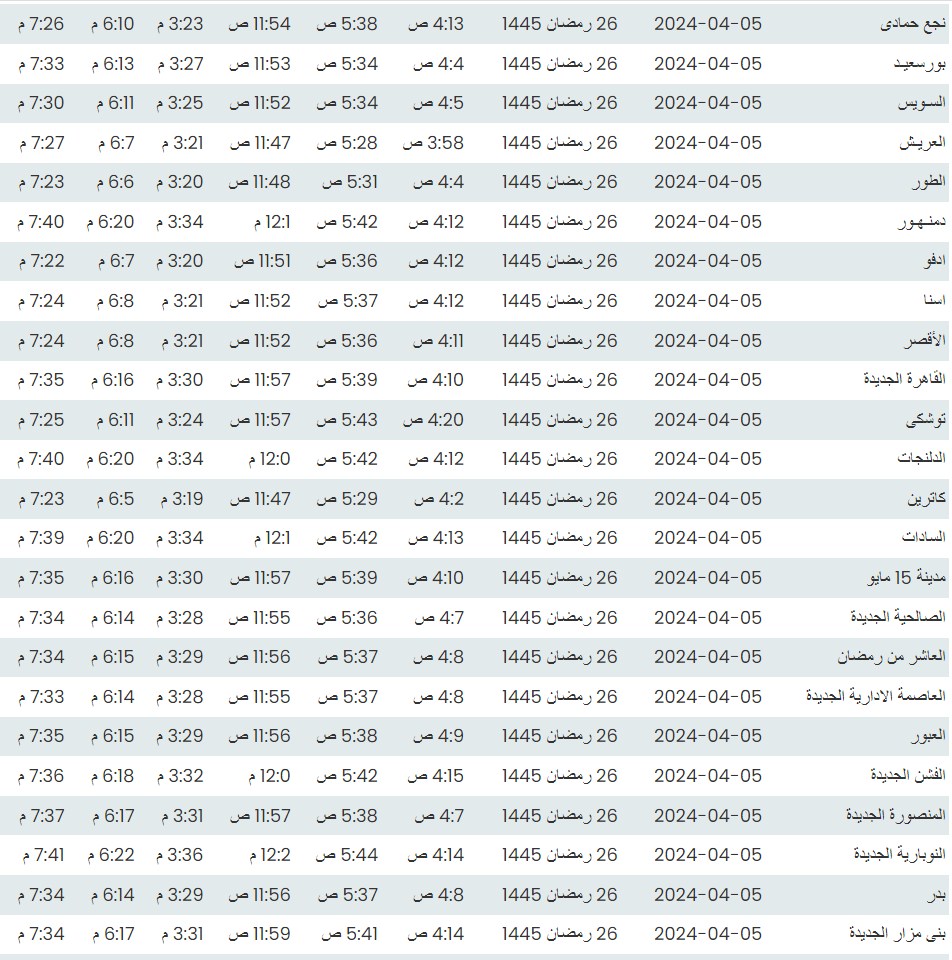 وفيما يلي مواقيت الصلاة، لعدد من مدن ومحافظات الجمهورية من واقع بيانات الهيئة العامة للمساحة