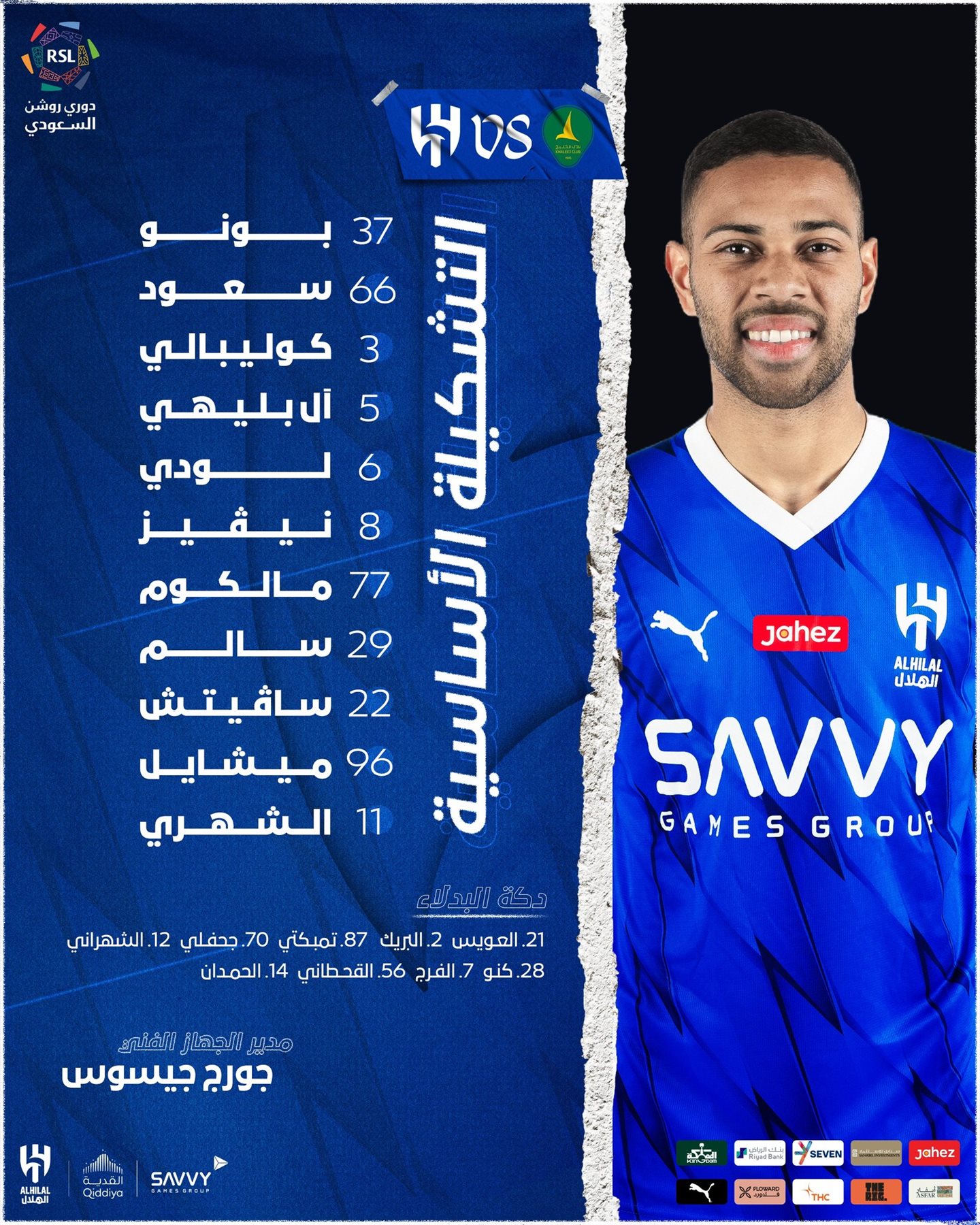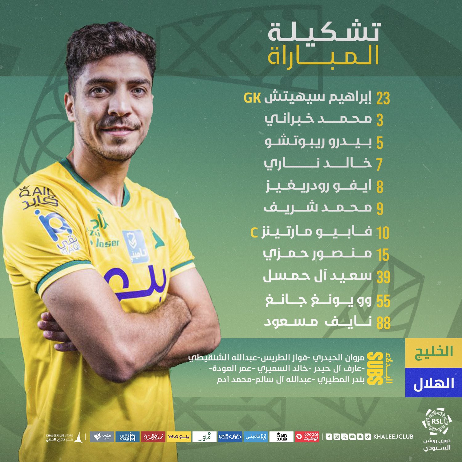 وكان البرتغالي جيسوس المدير الفني لفريق الهلال، وبيدرو إيمانويل مدرب الخليج، أعلنا تشكيل فريقهما للمواجهة التي تجمعهما على ملعب ستاد الأمير محمد بن فهد، ضمن منافسات الجولة 27، من الدوري السعودي للمحترفين، "دوري روشن".
