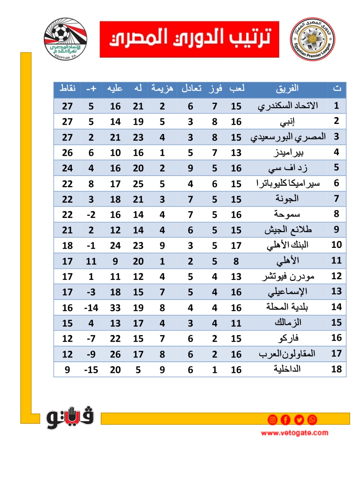 ويتساوى ثلاث فرق وهم الاتحاد السكندري وإنبي والمصري البورسعيدي في صدارة جدول ترتيب الدوري المصري لكن الأفضلية لفريق زعيم الثغر بالأهداف.