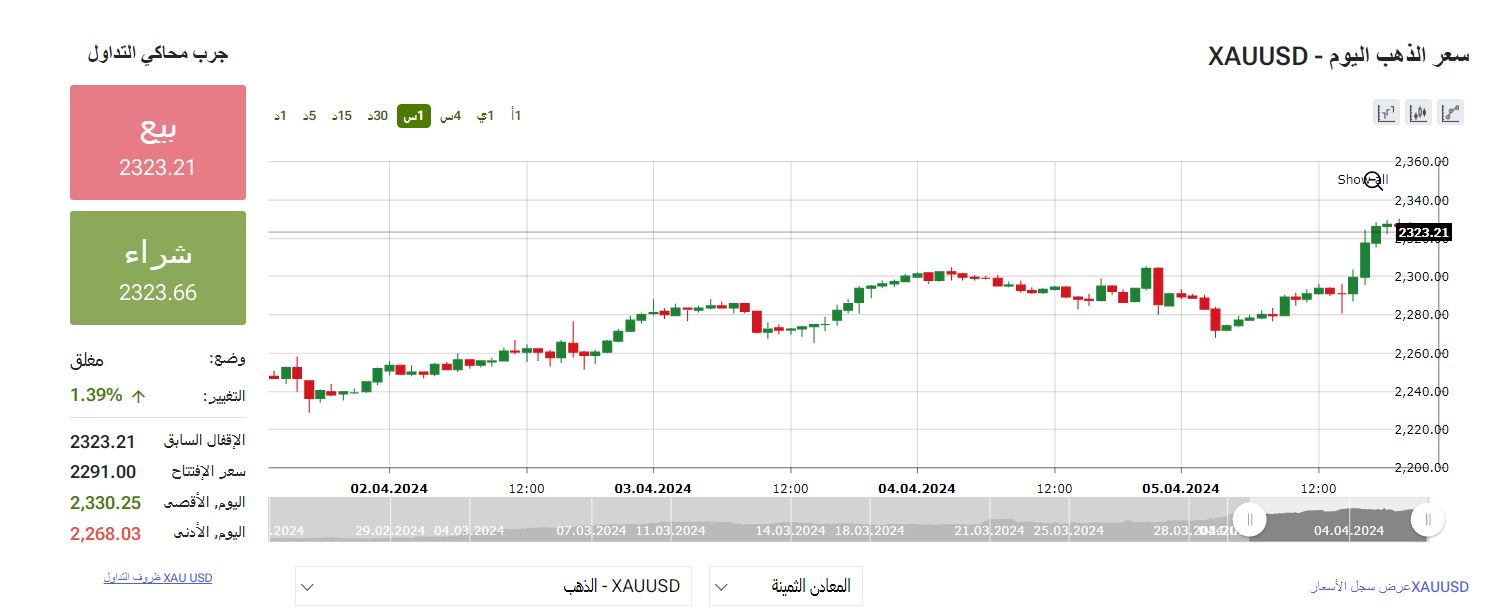 مؤشر أسعار الذهب عالميا ، صعد مؤشر أسعار الذهب عالميا بشكل مفاجئ بزياده 100 دولارا للأوقية الواحده ليستقر الان عند مستوى 2323 دولارا، بحركة تداولات الأسبوع الأول من أبريل الجارى، على خلفية هبوط مؤشر الدولار الأمريكي بالإضافة إلى اقتراب موعد اجتماع الفيدرالي الأمريكى حيث انه من المتوقع ان يتم تخفيض اسعار الفائده بنهاية أبريل الجارى 2024.