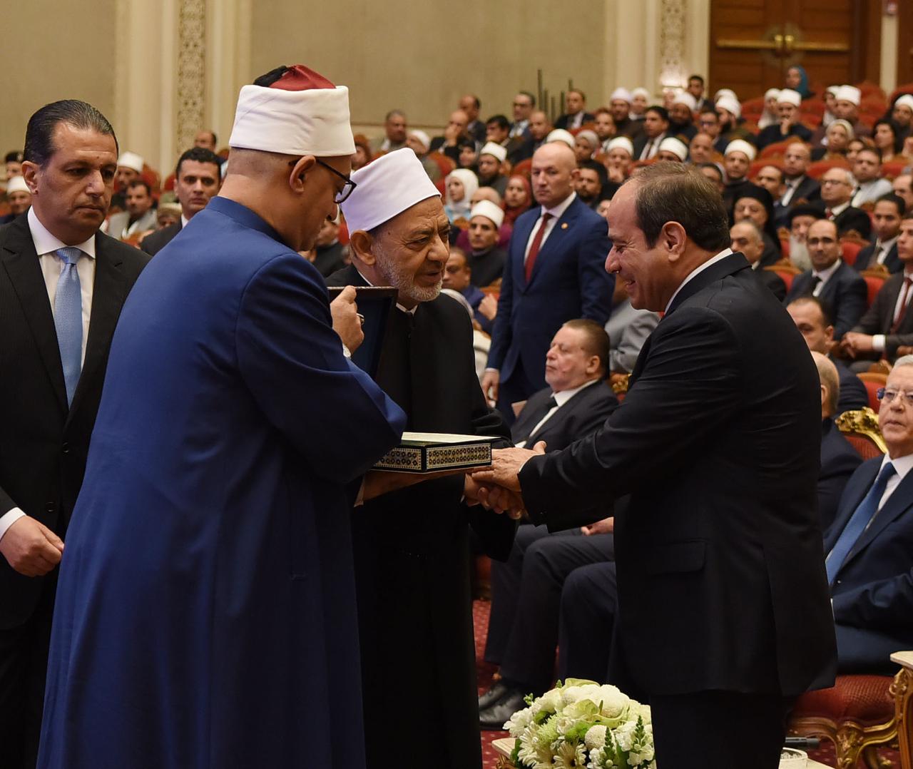 وجه الرئيس عبد الفتاح السيسي، خلال كلمته بالاحتفالية التي نظمتها وزارة الأوقاف احتفاء بليلة القدر، التحية لفضيلة الإمام الأكبر الدكتور أحمد الطيب شيخ الأزهر تقديرا لجهوده في تصحيح المفاهيم الخاطئة والتصدي للغلو والتطرف، ومواجهة الفكر المنحرف، حيث قال: " أتوجه بالتهنئة، لحفظة كتاب الله، وبالتحية إلى فضيلة الإمام الأكبر، شيخ الأزهر، وإلى العلماء المخلصين من رجال الأزهر الشريف، ووزارة الأوقاف الذين يعملون على تصحيح المفاهيم الخاطئة بشأن الدين الإسلامي السمح، ونهجه الوسطي المعتدل والتصدي للغلو والتطرف، ومواجهة الفكر المنحرف".
