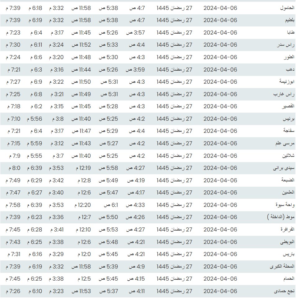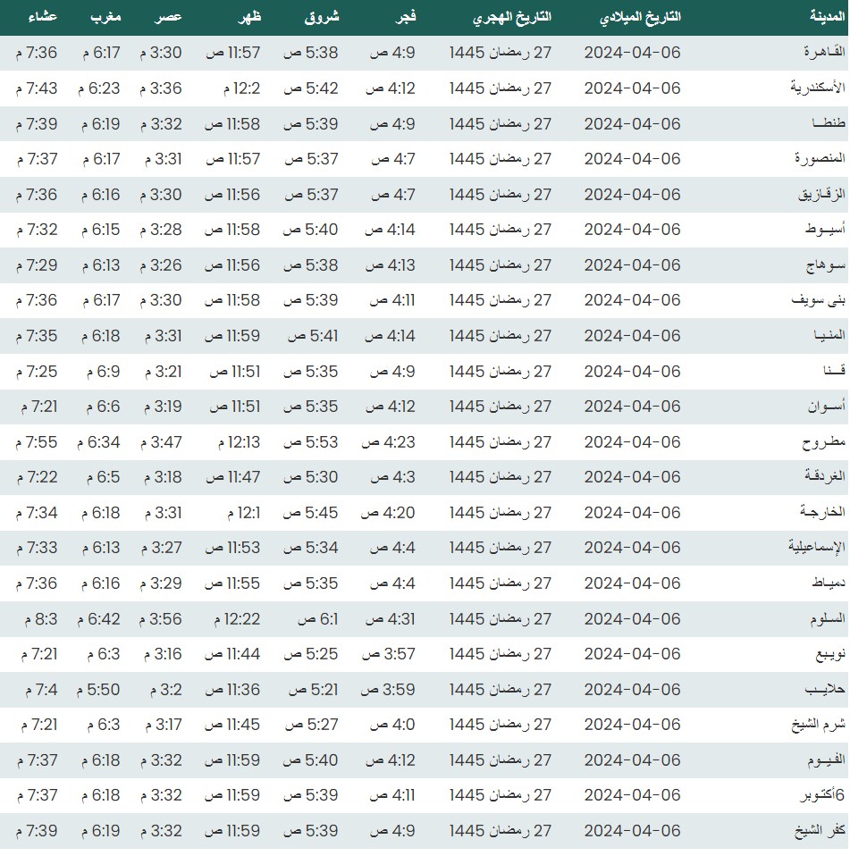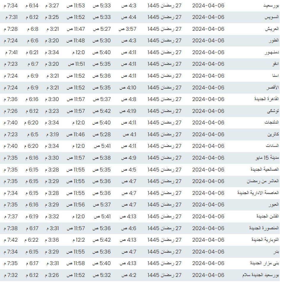 وفيما يلي مواقيت الصلاة، لعدد من مدن ومحافظات الجمهورية من واقع بيانات الهيئة العامة للمساحة
