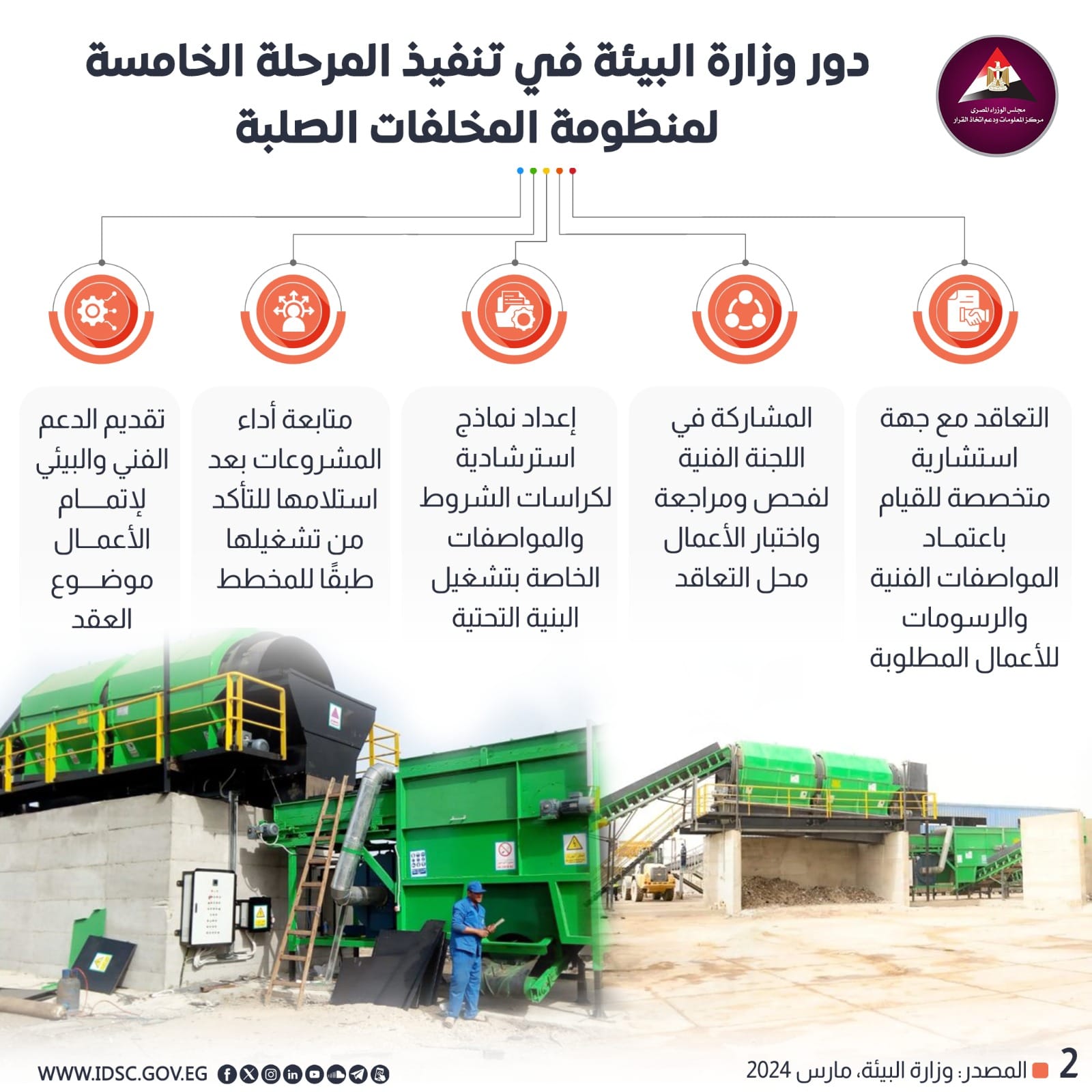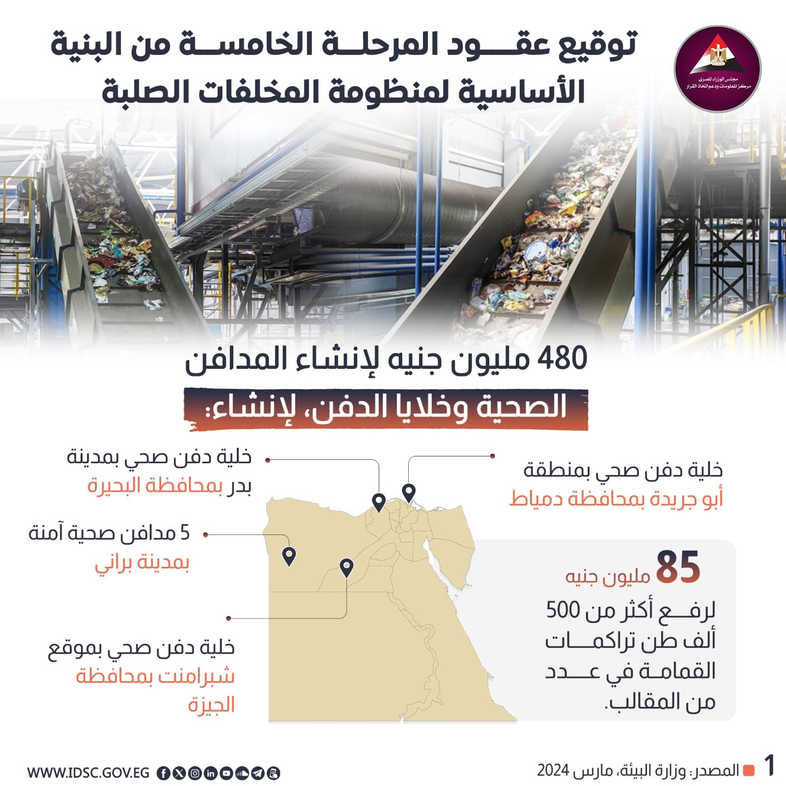كشفت الصفحة الرسمية لمركز المعلومات ودعم اتخاذ القرار بمجلس الوزراء على موقع التواصل الاجتماعي "فيسبوك" عن توقيع عقود المرحلة الخامسة من البنية الأساسية لمنظومة المخلفات الصلبة.