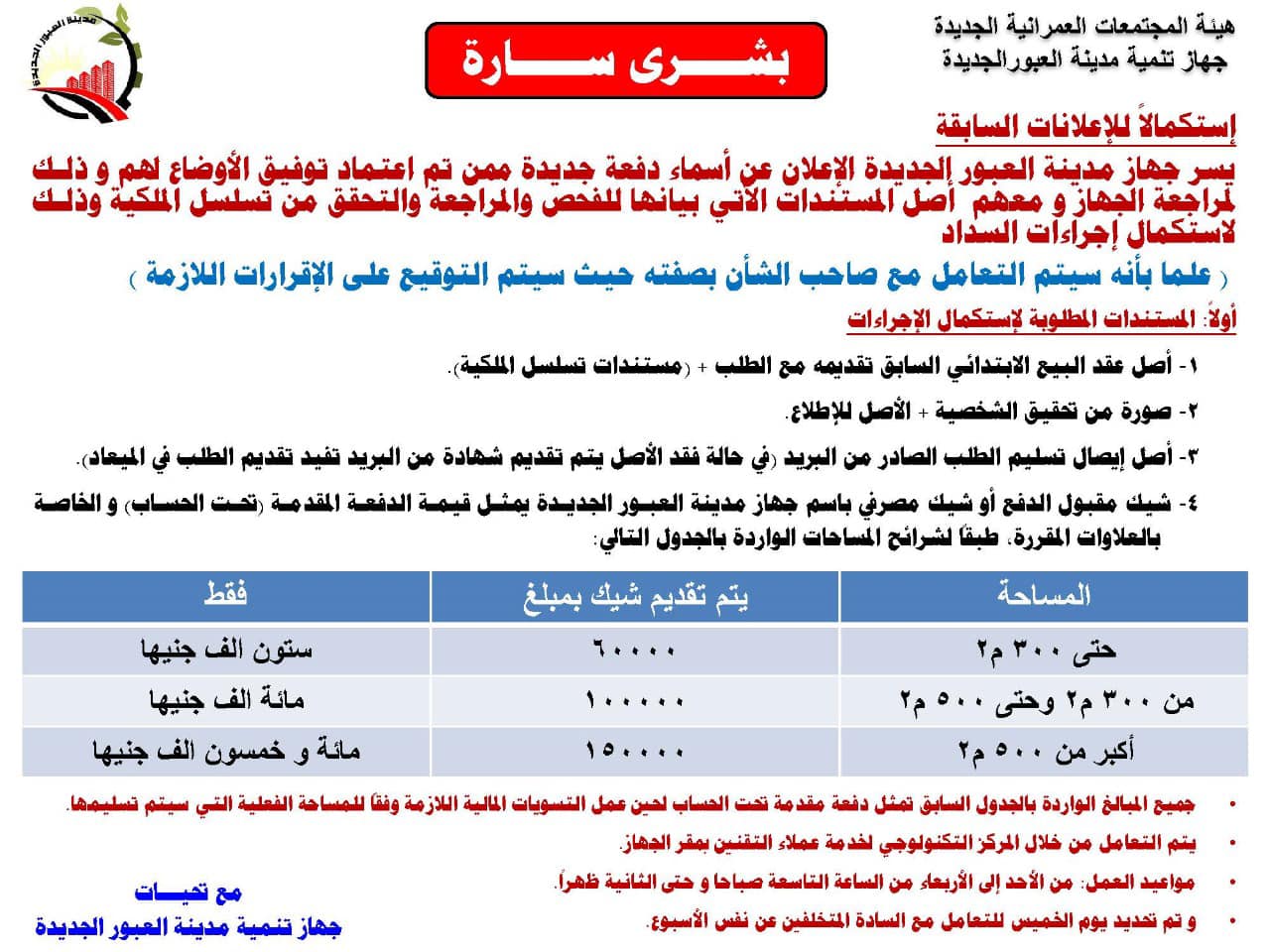 - شيك مقبول الدفع أو شيك مصرفي باسم جهاز مدينة العبور الجديدة يمثل قيمة الدفعة المقدمة تحت الحساب والخاصة بالعلاوات المقررة.