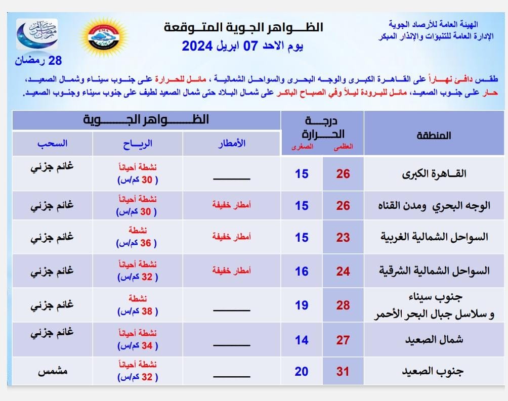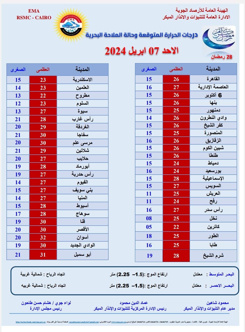 وكانت هيئة الأرصاد الجوية قد أعلنت حالة الطقس اليوم، وتوقعت أن يسود طقس دافئ نهارًا على القاهرة الكبرى والوجه البحري على السواحل الشمالية.