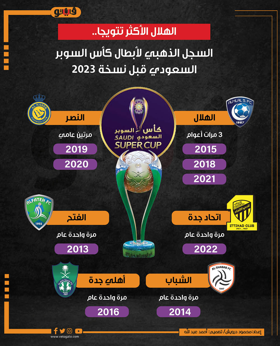 الهلال الأكثر تتويجا.. السجل الذهبي لأبطال كأس السوبر السعودي قبل نسخة 2023 (إنفوجراف) الأحد 07/أبريل/2024 - 01:58 م 4/7/2024 1:58:38 PM كأس السوبر السعودي، فيتو محمود درويش شارك طباعة 18 حجم الخط شارك طباعة كأس السوبر السعودي اتحاد جدة النصر الهلال الفتح الشباب أهلي جدة السوبر السعودي