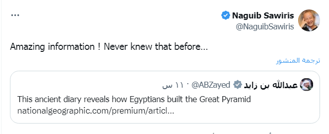 وفي رسالته لوزير خارجية الإمارات عن معجزة الهرم الأكبر، قال المهندس نجيب ساويرس: "معلومات مذهلة! لم أعرف ذلك من قبل…".