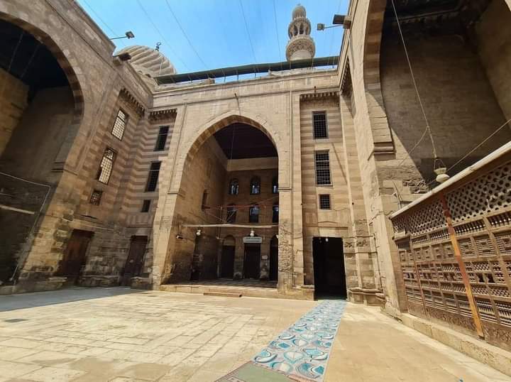 ويتكون المسجد من صحن مكشوفٍ كبيرٍ تحيط به أربعة إيواناتٍ معقودة الفتحات ويدلّ ما بقى من النّقوش المذهّبة بسقفيّ الإيوانين، البحري والقبلي، على ما كان عليه سقفا الإيوانين الآخرين من غنى وجمال.. وإيوان القبلة، على خلاف نظائره في المساجد الأخرى، ترك محرابه وجدرانه بغير وزرةٍ رخاميةٍ.. أما منبره، ولو أنّه فقد الجزء العلوي منه، إلاّ أنه يُعتبر من المنابر الخشبية الدّقيقة الصنع، اجتمعت فيه دقّة الحفر في الخشب وجمال التّطعيم فهو مصنوع بطريقة الحشوات المجمعة وكُتِبَ بأعلى بابه تاريخ عمله، سنة 774 هـ.
