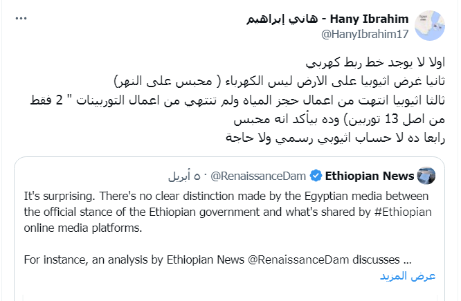 وردًا على أحد متابعيه عن قدرة مصر على استغلال المياه، قال الباحث في الشأن الإفريقي هاني إبراهيم: "لو الـ 42 مليار متر مكعب، اللي في السد الكارثي سد النهضة، وصلوا لمصر هنضاعف ساعات تشغيل السد العالي، كونك تستغلها وتقول طاقة نظيفة بالتبعية هتخفض من قدرة السد العالي (طاقة نظيفة أيضًا) وبالتالي لكي نسد العجز في الطاقة نعتمد على طاقة غير نظيفة لتعويض العجز وده من أضرار السد الإثيوبي"