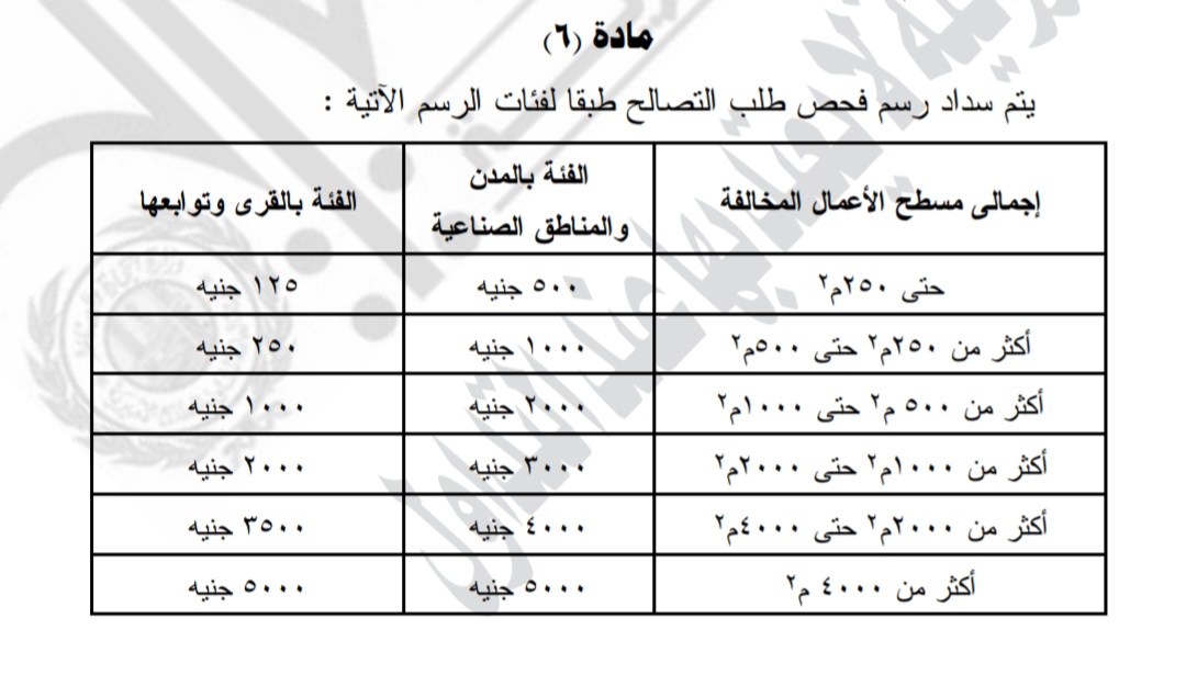 ووفقا لنص الـمادة ٦ من اللائحة التنفيذية لقانون التصالح في مخالفات البناء جاءت قيمة الرسوم كالتالي: