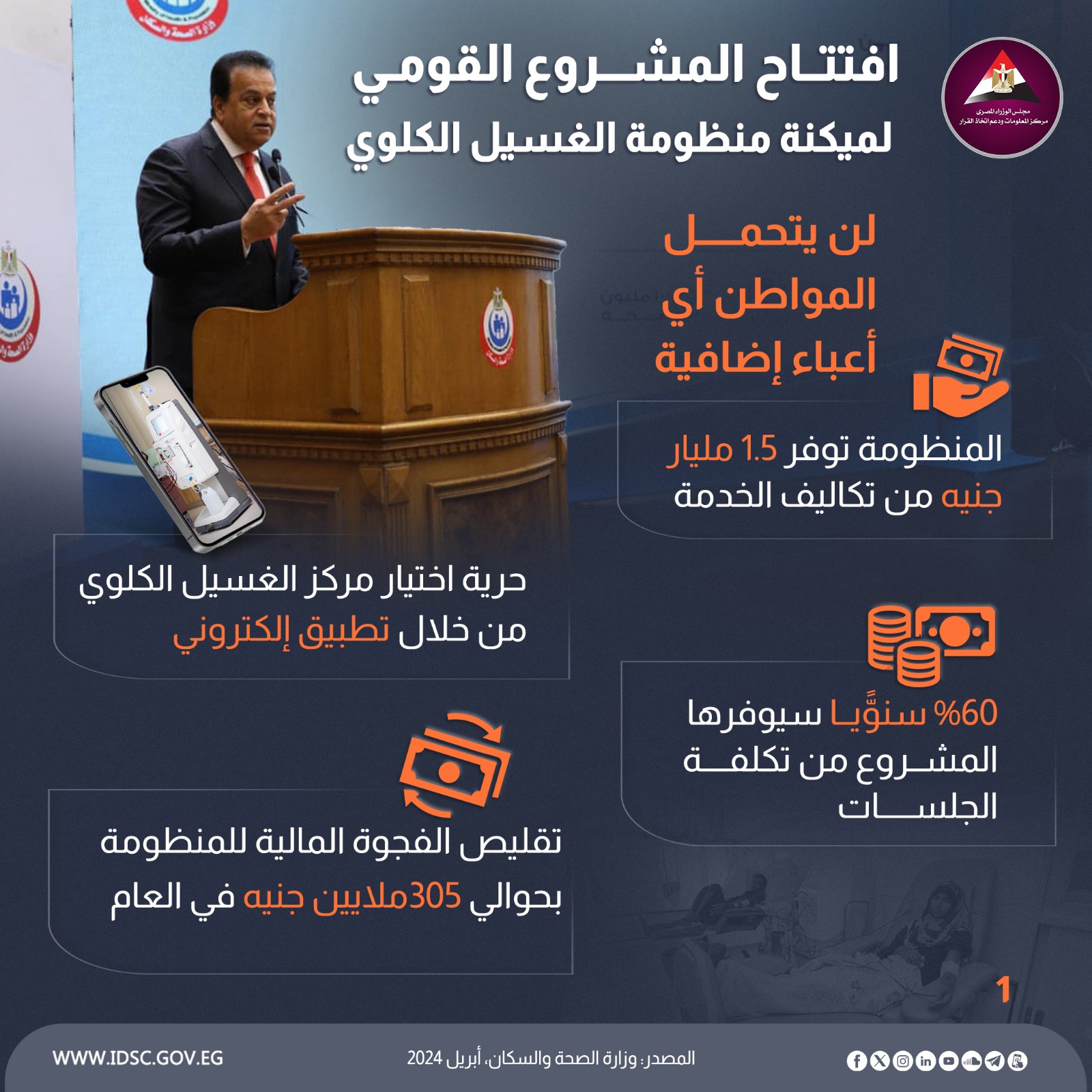 وذلك في إطار توجه الدولة المصرية لتطبيق التحول الرقمي، وتنفيذًا لأهداف التنمية المستدامة ورؤية مصر 2030، افتتح الدكتور خالد عبد الغفار، وزير الصحة والسكان، المشروع القومي لميكنة منظومة الغسيل الكلوي بما سيوفر 60٪ سنويًّا من تكلفة الجلسات، وتقليص الفجوة المالية للمنظومة الجديدة بنحو 305 ملايين جنيه في العام، مع توفير 1.5 مليار جنيه تكلفة مباشرة وغير مباشرة للخدمة المقدمة.