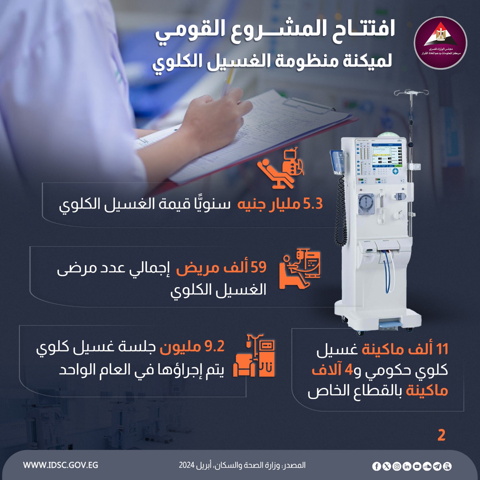 كشفت الصفحة الرسمية لمركز المعلومات ودعم اتخاذ القرار بمجلس الوزراء على موقع التواصل الاجتماعي "فيسبوك" تفاصيل افتتاح المشروع القومي لميكنة منظومة الغسيل الكلوي.