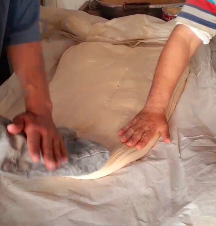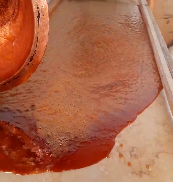وأضاف العم عبده أن التصنيع يتم من خلال وضع العسل الأسمر والأبيض والسكر فى قدر نحاسى ويتم التسوية على النار لمدة نصف ساعة للحصول على القوام المطلوب وتكون باللون الأحمر ثم بعد ذلك يتم وضعها على الرخامة ونقلها إلى المكد لتصليحها وتكون سلسة فى التعامل والتشكيل ثم بعد ذلك يتم إعادتها للترابيزة الرخام ووضع الحشو بداخلها وبعد ذلك يتم سحبها على ترابيزة أخرى وقصها وتغليفها وعرضها.