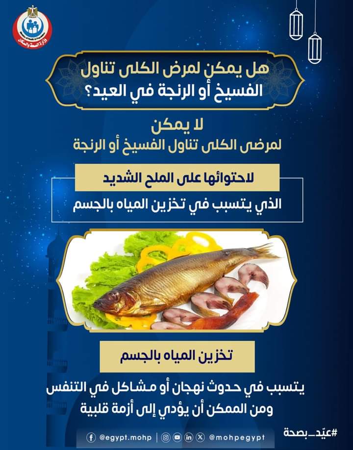 حذرت وزارة الصحة مرضى الكلى من تناول الفسيخ والرنجة في عيد الفطر المبارك.