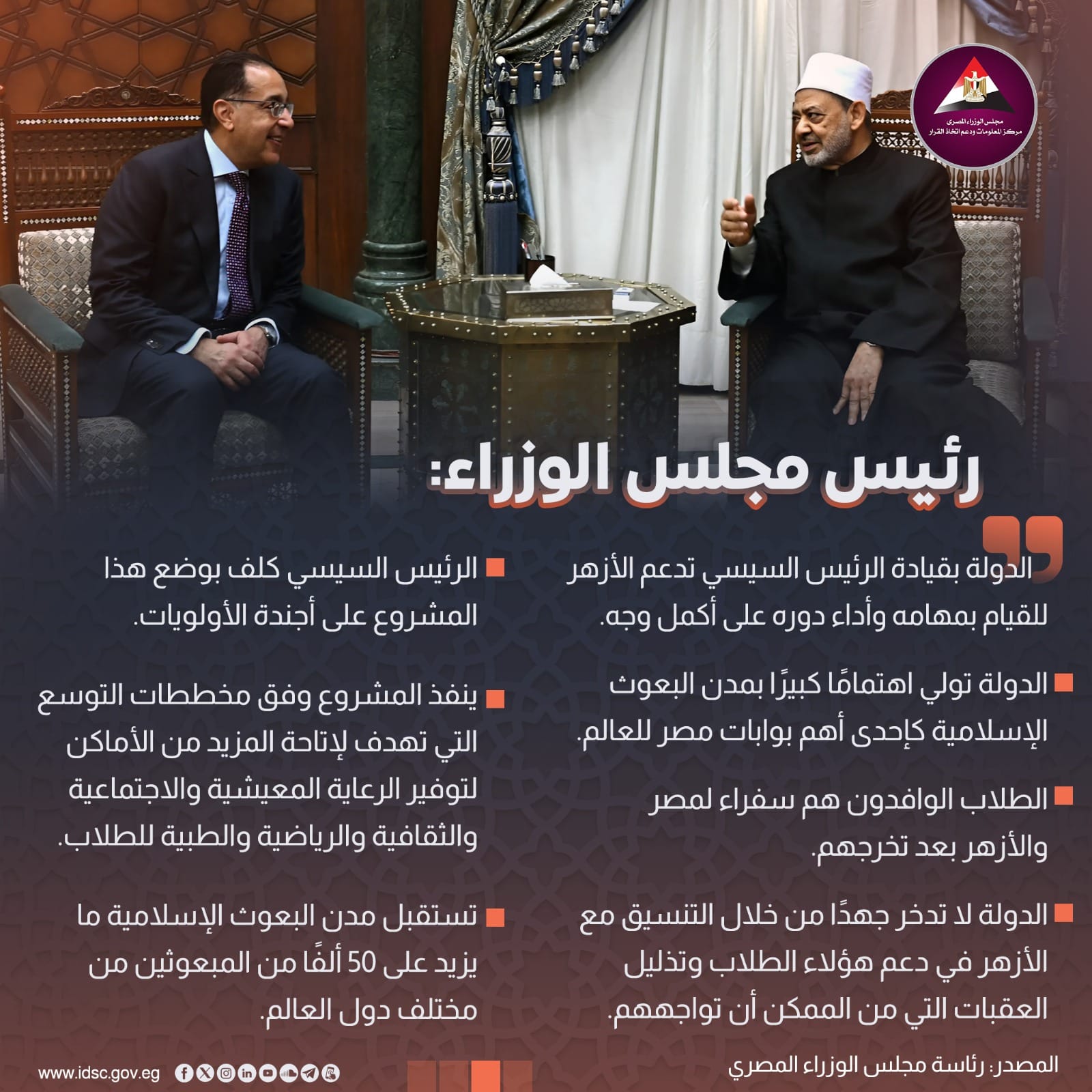 تفاصيل لقاء شيخ الأزهر ورئيس مجلس الوزراء لمتابعة مشروع مدينة البعوث (إنفوجراف)