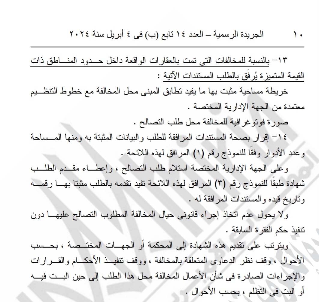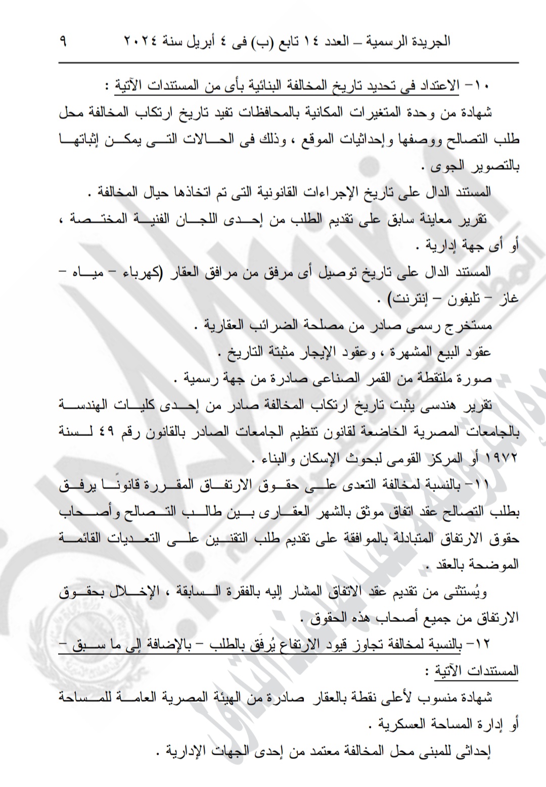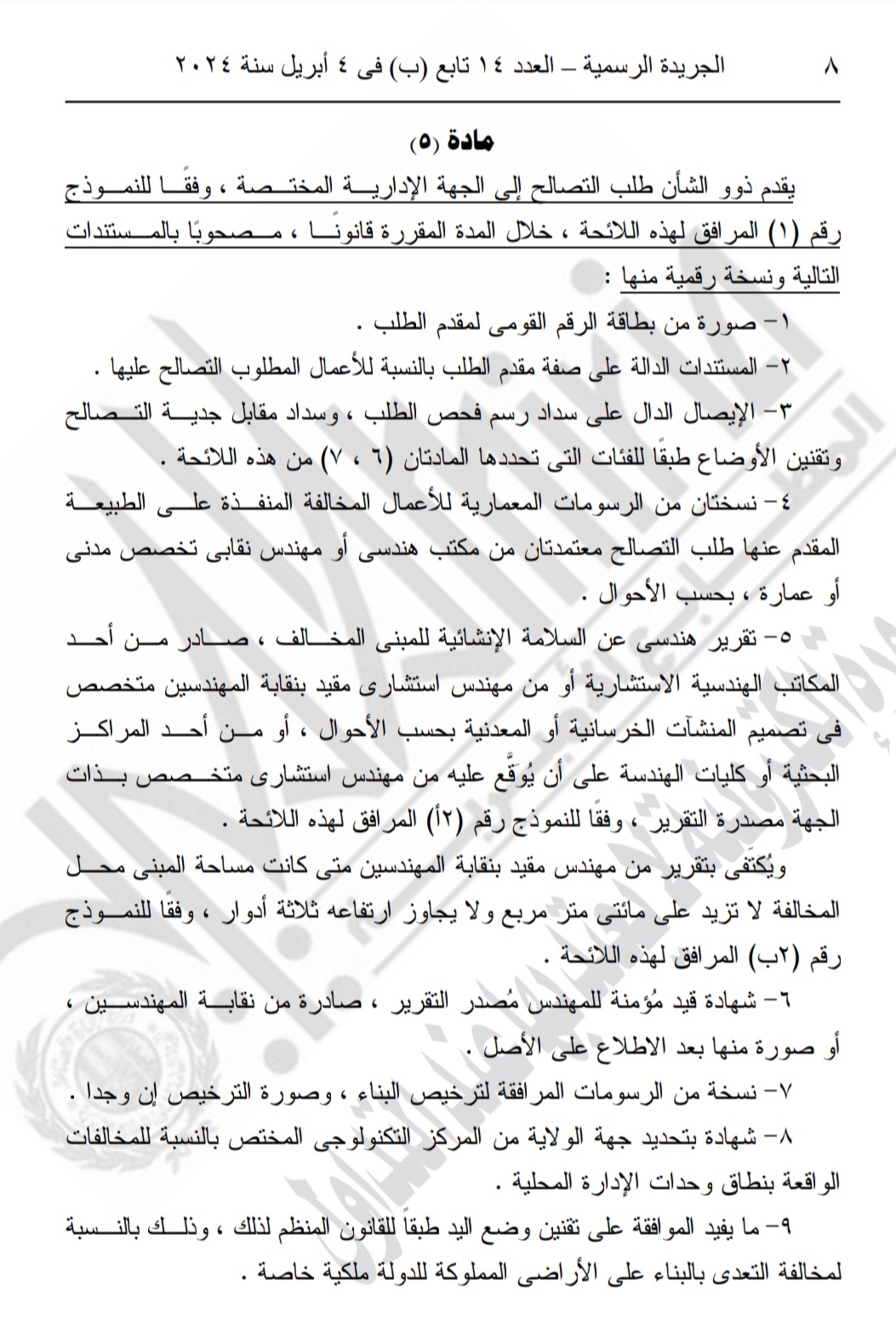 وجاءت تلك المستندات وفقا لنص الـمادة ٥ من اللائحة التنفيذية لقانون التصالح في مخالفات البناء.