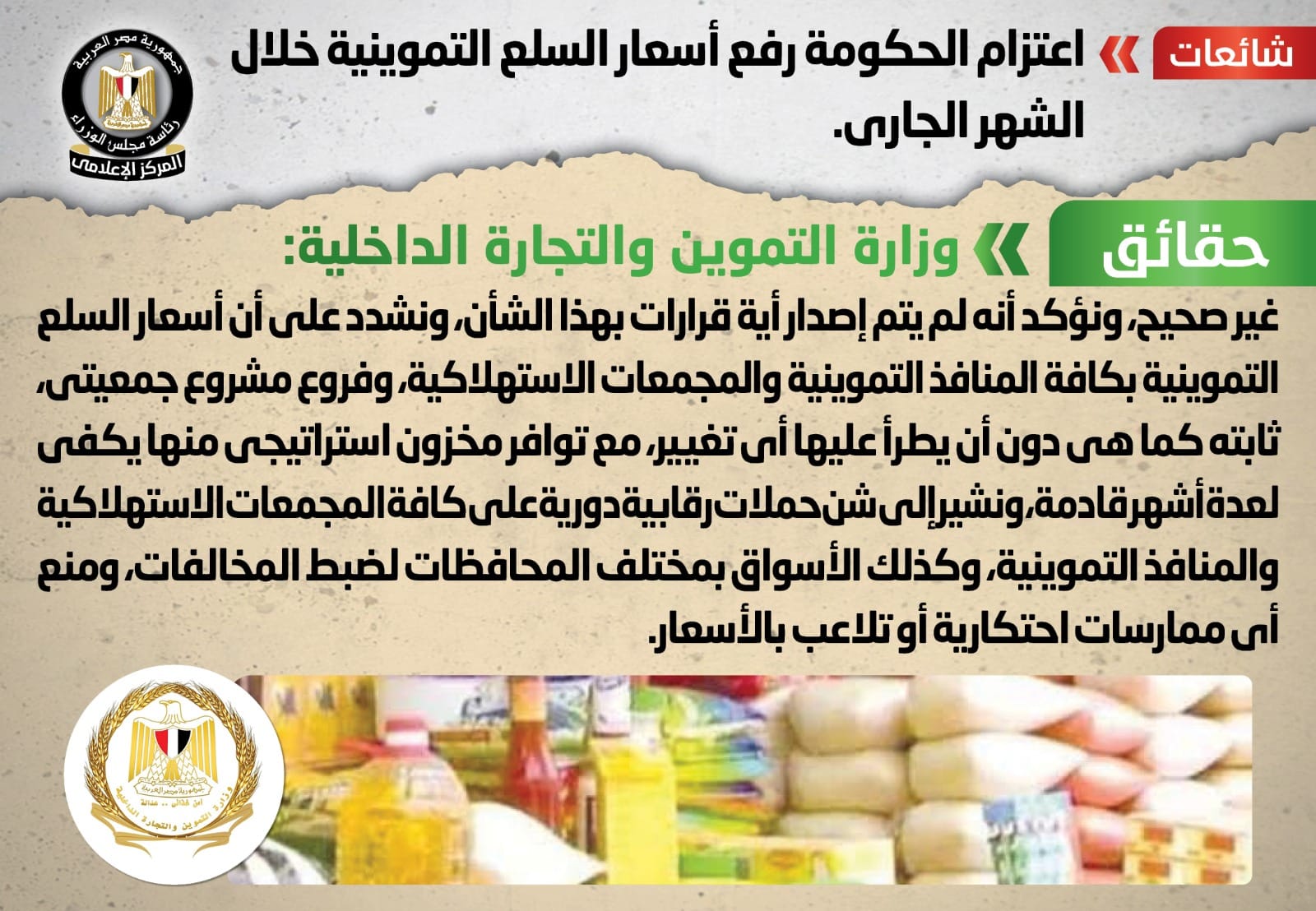 وقام المركز الإعلامي لمجلس الوزراء بالتواصل مع وزارة التموين والتجارة الداخلية، والتي نفت تلك الأنباء، مُؤكدةً أنه لا صحة لرفع أسعار السلع التموينية خلال الشهر الجاري، وأنه لم يتم إصدار أية قرارات بهذا الشأن، مشددةً على أن أسعار السلع التموينية بكافة المنافذ التموينية والمجمعات الاستهلاكية، وفروع مشروع جمعيتي، ثابته كما هي دون أن يطرأ عليها أي تغيير، مع توافر مخزون استراتيجي منها يكفي لعدة أشهر قادمة، مشيرةً إلى شن حملات رقابية دورية على كافة المجمعات الاستهلاكية والمنافذ التموينية، وكذلك الأسواق بمختلف المحافظات لضبط المخالفات، ومنع أي ممارسات احتكارية أو تلاعب بالأسعار.