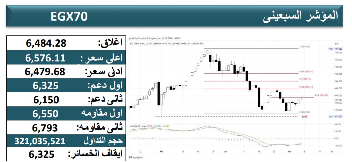 على الرسم البياني اليومي افتتح المؤشر السبعيني جلسة اليوم على وتيرة إيجابية، حيث شهد المؤشر ارتفاعا عند المستوى 6.486.48 بعد محاولة اختبار مستويات صاعدة قرب القمة الرئيسية المتكونة عند 7000 نقطة بحركة التعاملات، وهو المستوى الذي يحتاج المؤشر إلى اختراقه ليؤكد الاتجاه الصاعد لحالي وليؤهله إلى تسجيل المزيد من المستويات القياسية قرب المستويات التالية 7330 و7600 و8000 نقطة من منظور قصير الآجل ليبقى الاتجاه الصاعد قائمًا طالما ظل التداول أعلى القاع المتكون عند 6500 نقطة، والذي أصبح مستوى إيقاف الخسائر للاتجاه الصاعد الحالي حيث كسر هذا المستوى لأسفل سيلغي الاتجاه الصاعد وسيؤهله إلى الانخفاض قرب المستويات التالية عند 5930 و5533 و5273 نقطة.