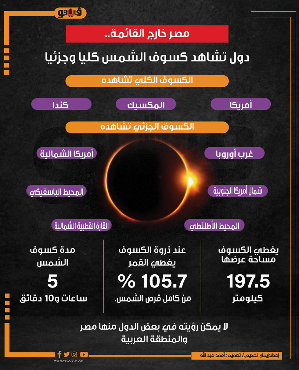 مصر خارج القائمة.. دول تشاهد كسوف الشمس كليا وجزئيا (إنفوجراف) الإثنين 08/أبريل/2024 - 03:27 م 4/8/2024 3:27:47 PM كسوف الشمس، فيتو إيمان الحديدى شارك طباعة 18 حجم الخط شارك طباعة كسوف أول كسوف في عام 2024 أول كسوف كلي في 2024 كسوف الشمس خطورة كسوف الشمس