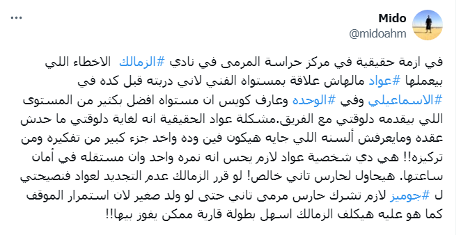 وفي حالة عدم التجديد لحارس مرمى الزمالك محمد عواد قال أحمد حسام "ميدو": "لو قرر الزمالك عدم التجديد لعواد فنصيحتي ل #جوميز لازم تشرك حارس مرمى تاني، حتى لو ولد صغير لأن استمرار الموقف كما هو عليه هيكلف الزمالك أسهل بطولة قارية ممكن يفوز بيها!!".