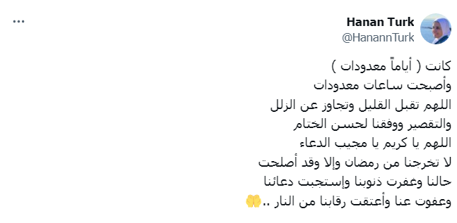 وقالت حنان ترك، في دعائها المؤثر في آخر يوم في رمضان: "كانت (أيامًا معدودات) وأصبحت ساعات معدودات اللهم تقبل القليل وتجاوز عن الزلل والتقصير ووفقنا لحسن الختام اللهم يا كريم يا مجيب الدعاء لا تخرجنا من رمضان وإلا وقد أصلحت حالنا وغفرت ذنوبنا واستجبت دعائنا وعفوت عنا وأعتقت رقابنا من النار"