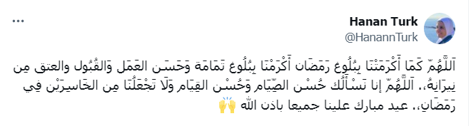 واختتمت الفنانة المعتزلة حنان ترك دعائها قائلة: "اَللَّهُمّ كَمَا أَكْرَمَتْنَا بِبُلُوغ رَمَضَان أَكْرَمْنَا بِبُلُوغ تَمَامَة وَحَسَن العَمَل وَالقُبُول والعتق مِن نِيرَانِهُ،. اَللَّهُمّ إنا نَسْأَلُك حُسْن الصِّيَام وَحُسْن القِيَام وَلَا تَجْعَلُنَا مِن الخَاسِرَيْن فِي رَمَضَانِ،. عيد مبارك علينا جميعا باذن الله"