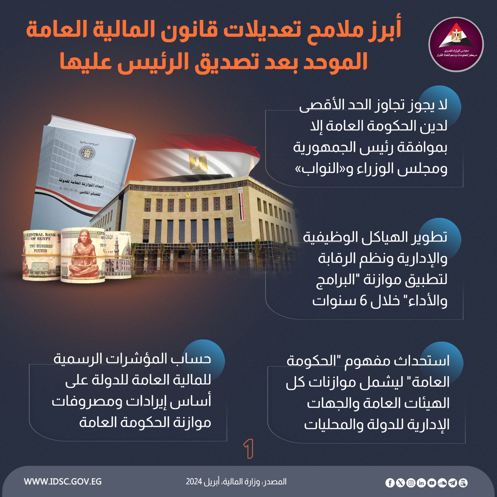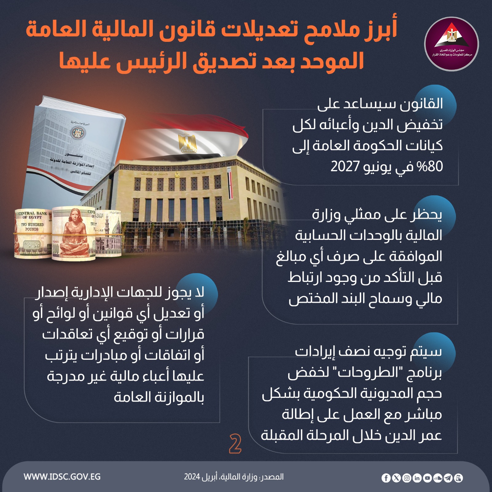 كشفت الصفحة الرسمية لمركز المعلومات ودعم اتخاذ القرار بمجلس الوزراء على موقع التواصل الاجتماعي "فيسبوك" عن أبرز ملامح تعديلات قانون المالية العامة الموحد بعد تصديق الرئيس الجمهورية عليها.