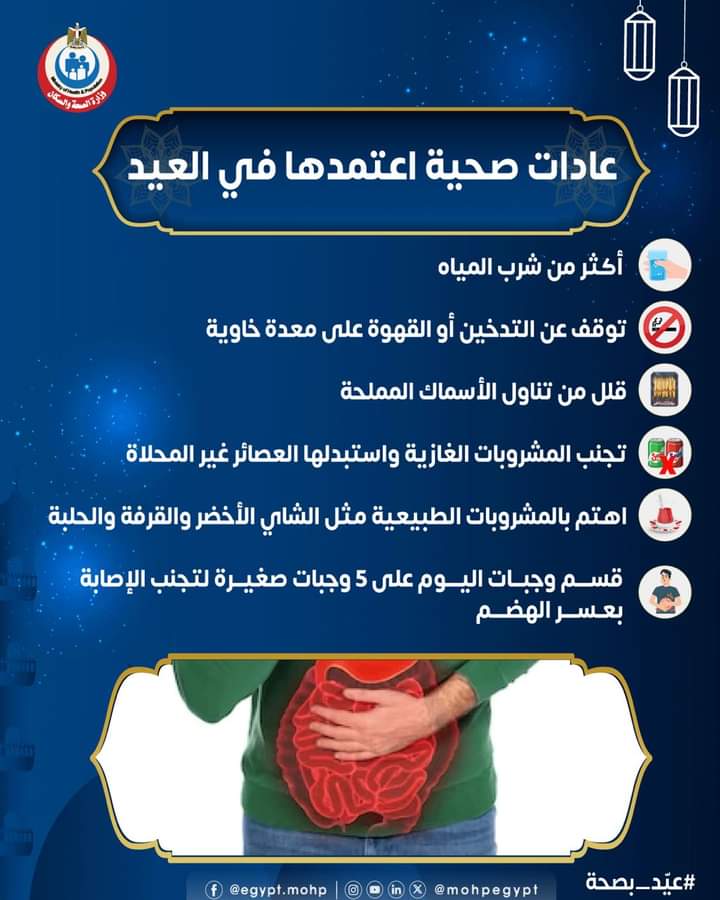 وجهت وزارة الصحة نصائح في أول يوم عيد الفطر المبارك لتهيئة المعدة بعد صيام شهر رمضان، ولقضاء العيد في صحة، وبدون آلام أو متاعب.