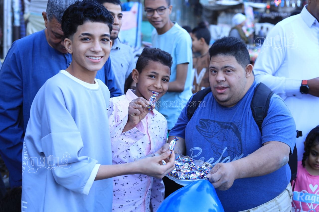 وزع شاب قبطي من ذوي الهمم يدعى رامي مخلص من أبناء مدينة إسنا جنوب محافظة الأقصر، الحلوى على الأطفال والمواطنين، بميدان أحمد عرابي وسط مدينة إسنا، عقب أدائهم صلاة عيد الفطر المبارك.