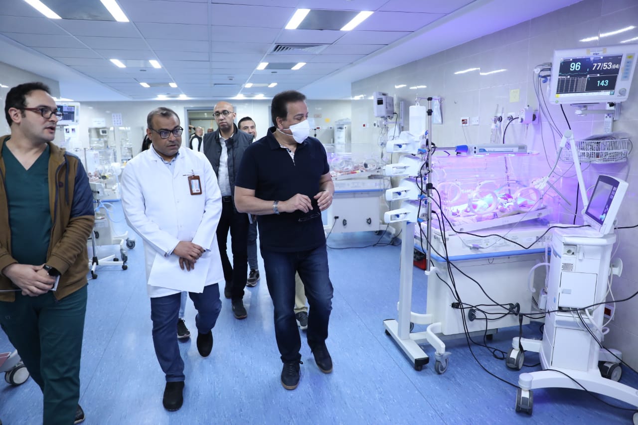 ولفت «عبدالغفار» إلى أن الوزير تابع جولته بتفقد غرف حضانات الأطفال المبتسرين التي تعمل بقوة 15 حضانة، واستمع إلى تقرير مفصل عن حالتهم الصحية والإجراء الطبي المتبع لكل حالة، كما تفقد وحدة الرعاية المركزة للأطفال.
